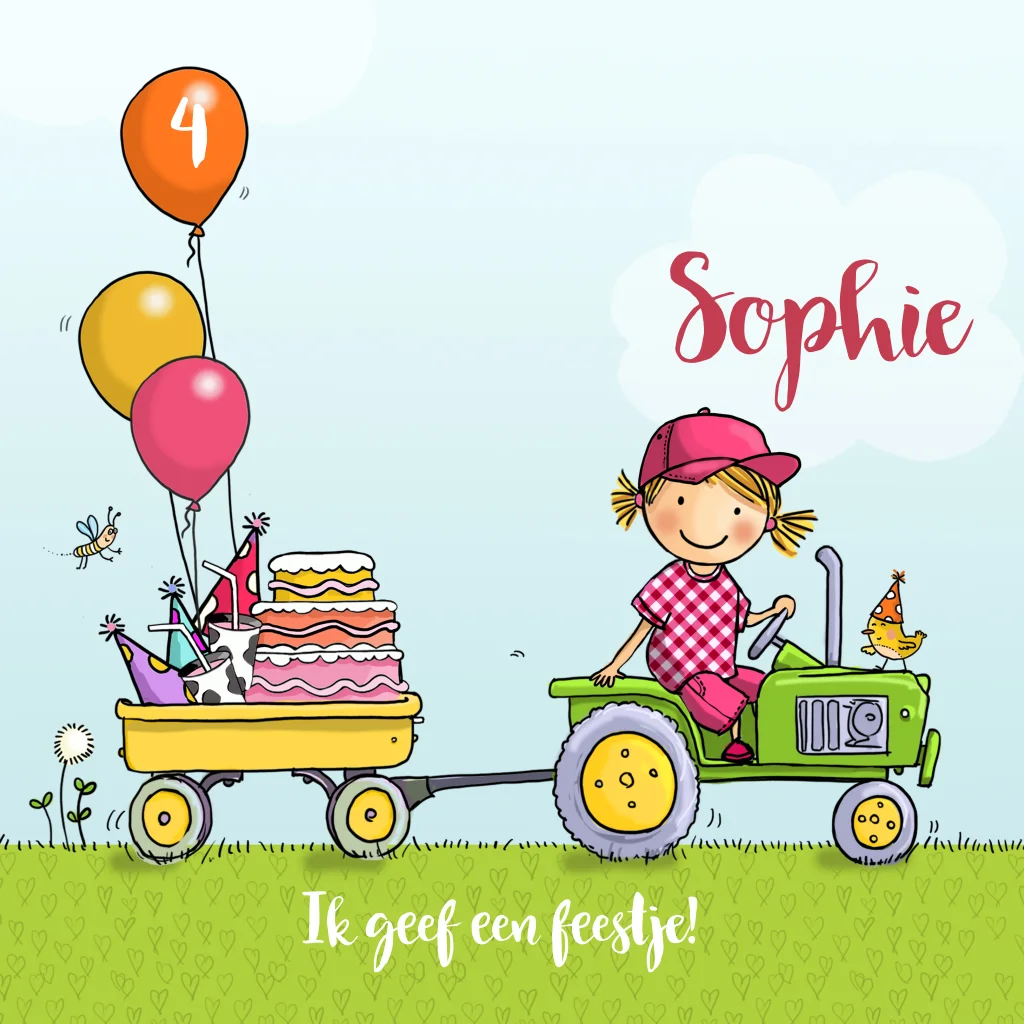 Grappige uitnodiging voor het kinderfeestje van jullie dochter. Wat een vrolijk boerinnetje zit er op de tractor vol met verjaardagspulletjes. Met taarten, versiersels en ballonnen gaat dit vast een geweldig leuk feestje worden! Je kunt eenvoudig zelf de tekst aanpassen in de online editor.