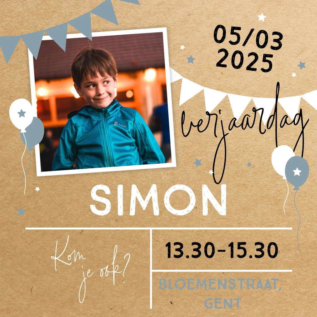 Hoe stoer is deze uitnodiging voor jouw zoontje? Op een kraft-achtergrond is ruimte om een leuke eigen foto toe te voegen. De naam en datum vallen goed op in de trendy letters en de ballonnen en vlaggetjes in blauw en wit maken het een feestelijk geheel. Liever andere kleuren of lettertypes? Pas het eenvoudig aan in de online editor. Zo gedaan!