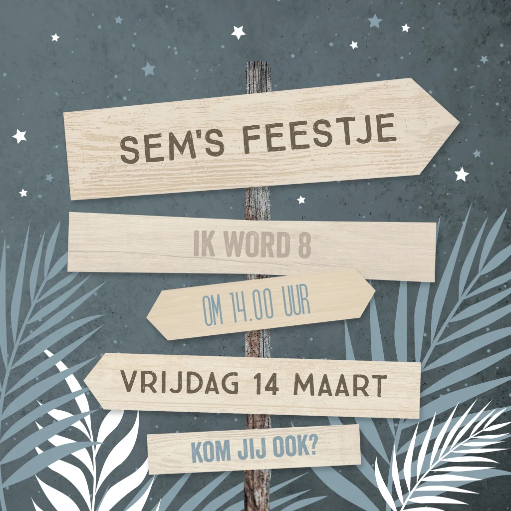 Een stoere uitnodiging voor een kinderfeestje van een jongen, met een strandpaal, planten en sterren op een grijze achtergrond.