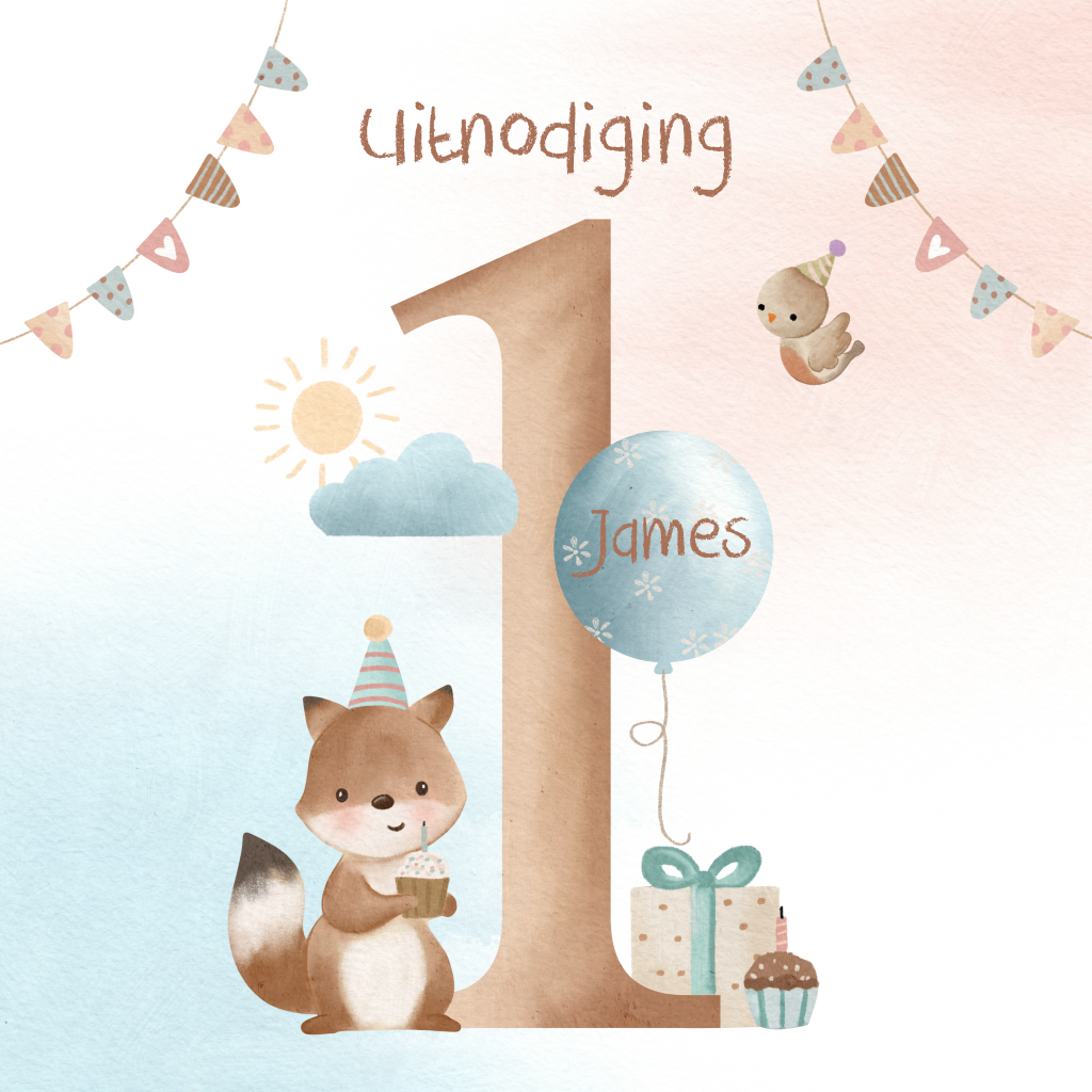 Grappige uitnodiging voor de eerste verjaardag van jullie zoon of dochter. Bij een grote 1 zit een lief vosje op een blauw met roze waterverf achtergrond met zon en wolkje. De feestmuts, vlaggetjeslijn, ballon, taartje en cadeautje zorgen voor een feestelijk tafereel!