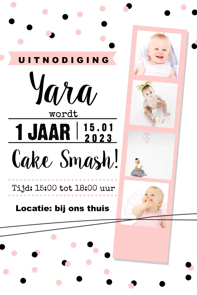Hippe en feestelijke verjaardagskaart om vrienden en familie uit te nodigen voor de 1e verjaardag van je dochter. Met peach kleurige stipjes en een stoere fotostrip waar je 4 mooie foto's van de kleine meid in kunt plaatsen, pas de kaart aan in de online editor voor een uniek exemplaar!