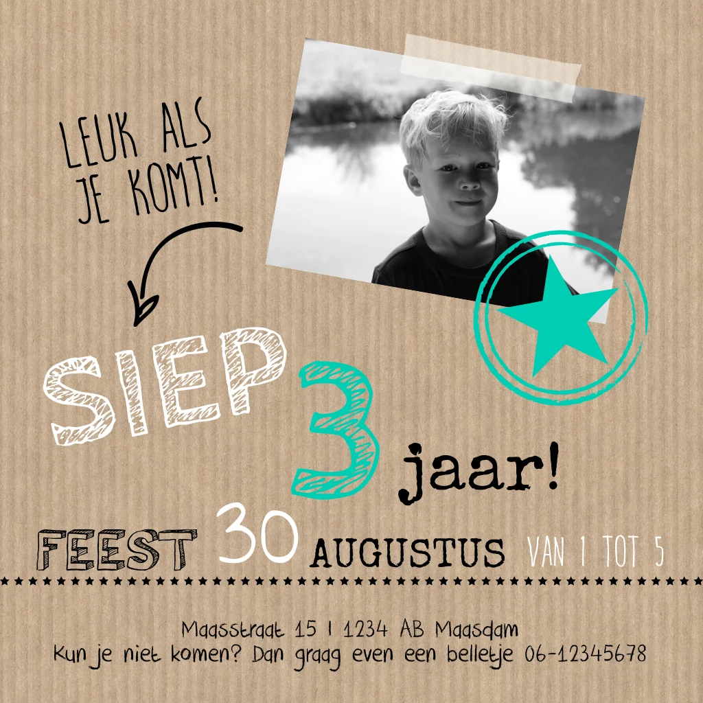 Hippe verjaardagskaart van kraftkarton met een eigen foto, trendy lettertypes en stempel en 3 in felgroen. Pas de kaart naar wens aan in de editor en maak hem persoonlijk Leuk voor een jongen van drie jaar! Maak hem compleet met een enveloppe van kraft of in een bijpassende kleur.