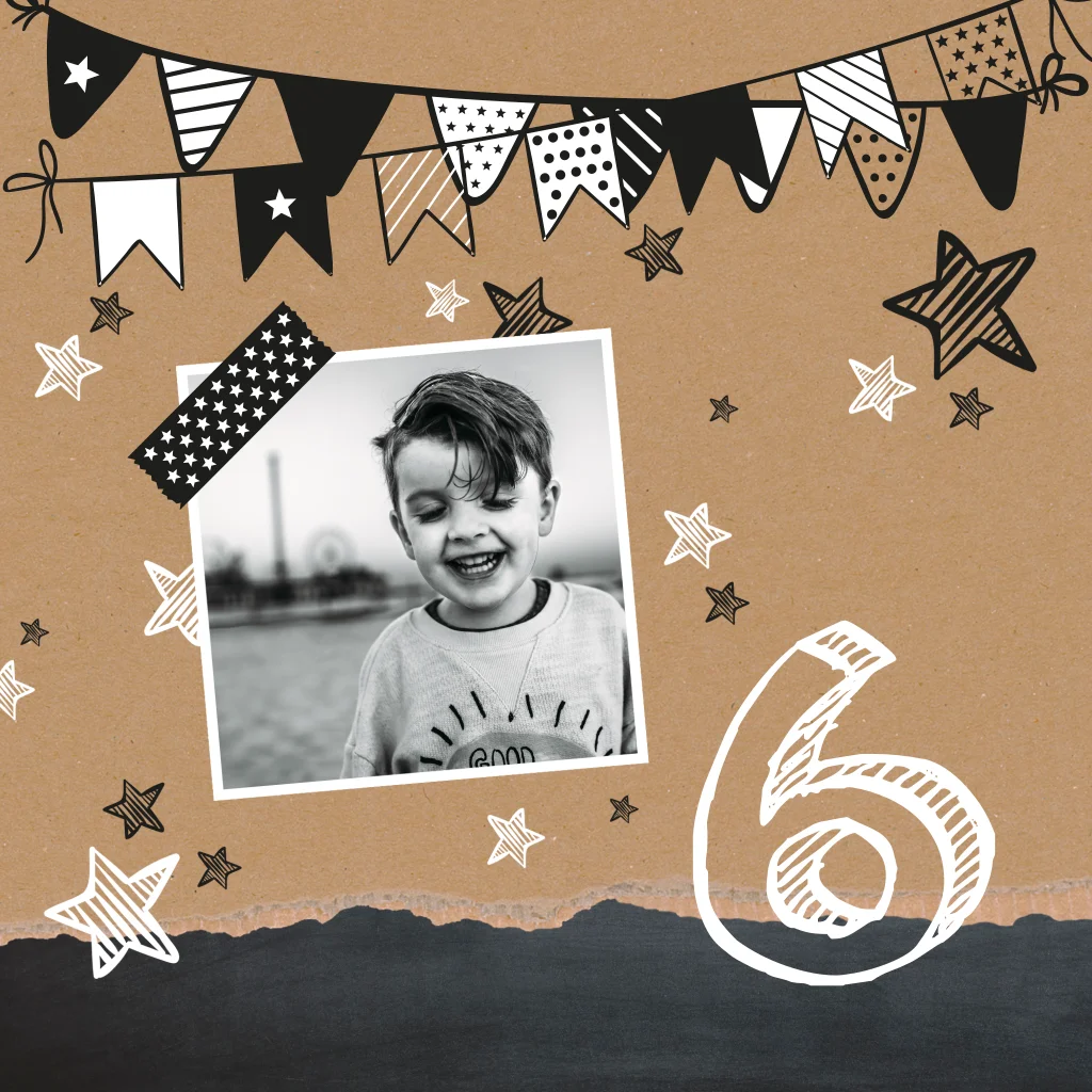 Hip en stoer kaartje om vriendjes uit te nodigen voor jouw verjaardag. Op de kraft-achtergrond staan vrolijke sterren en slingers. In het fotokader met tape kun je een stoere foto uploaden. Pas de teksten eenvoudig zelf aan in de editor, zo gedaan!
