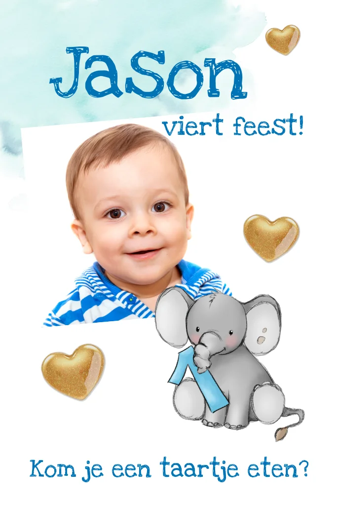 Lief, fris verjaardagskaartje met turquoise watercolour-achtergrond, getekend olifantje en hartjes in goudlook. Met een eigen foto maak jij hem af! Upload een leuke foto en voeg eigen tekst toe in de online editor, zo gedaan!