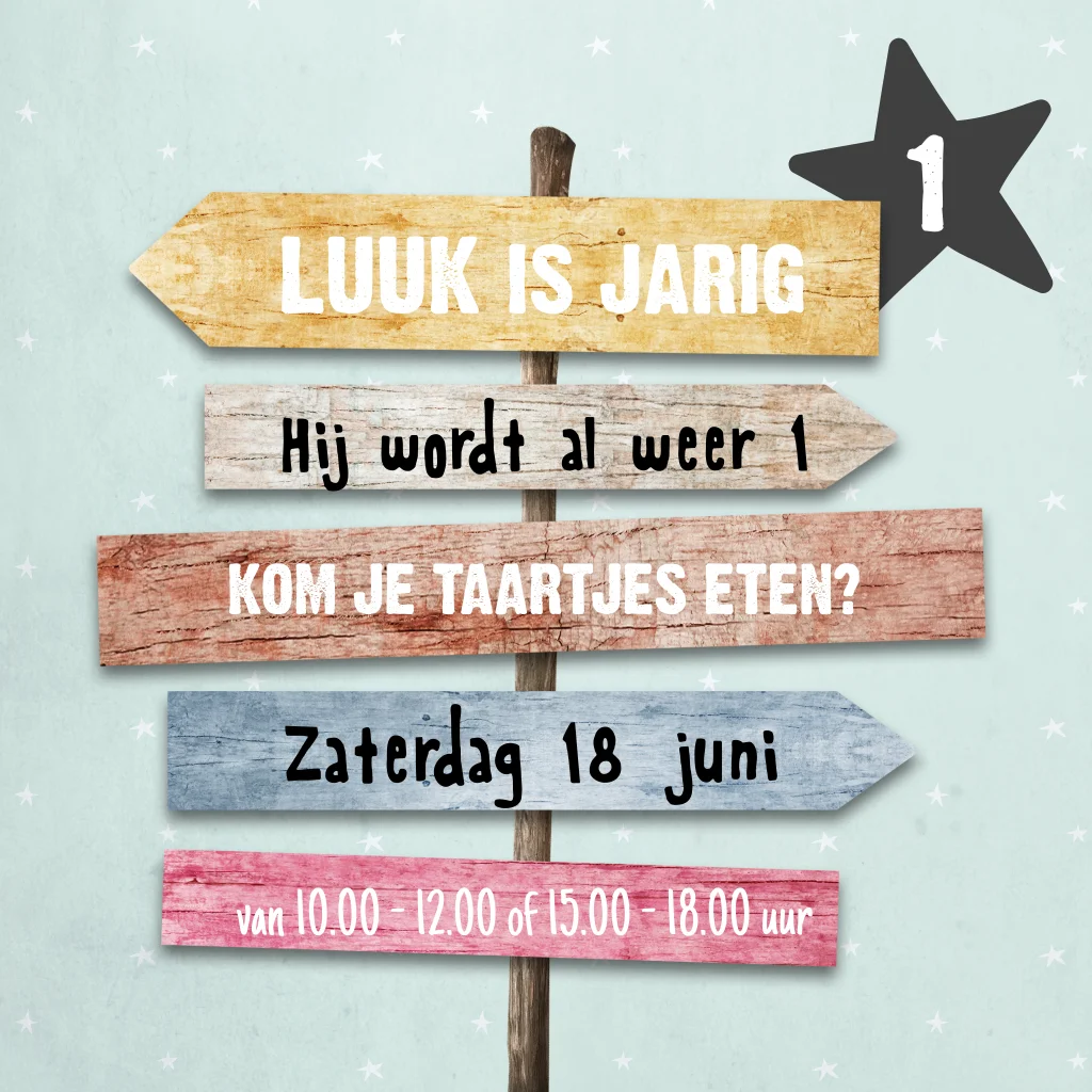 Een mintgroen uitnodigingskaartje met een houten wegwijzer met gekleurde planken met teksten: wat hip en stoer! Wanneer is het eerste feestje van jullie zoontje? Pas de tekst op de borden eenvoudig zelf aan in de editor.