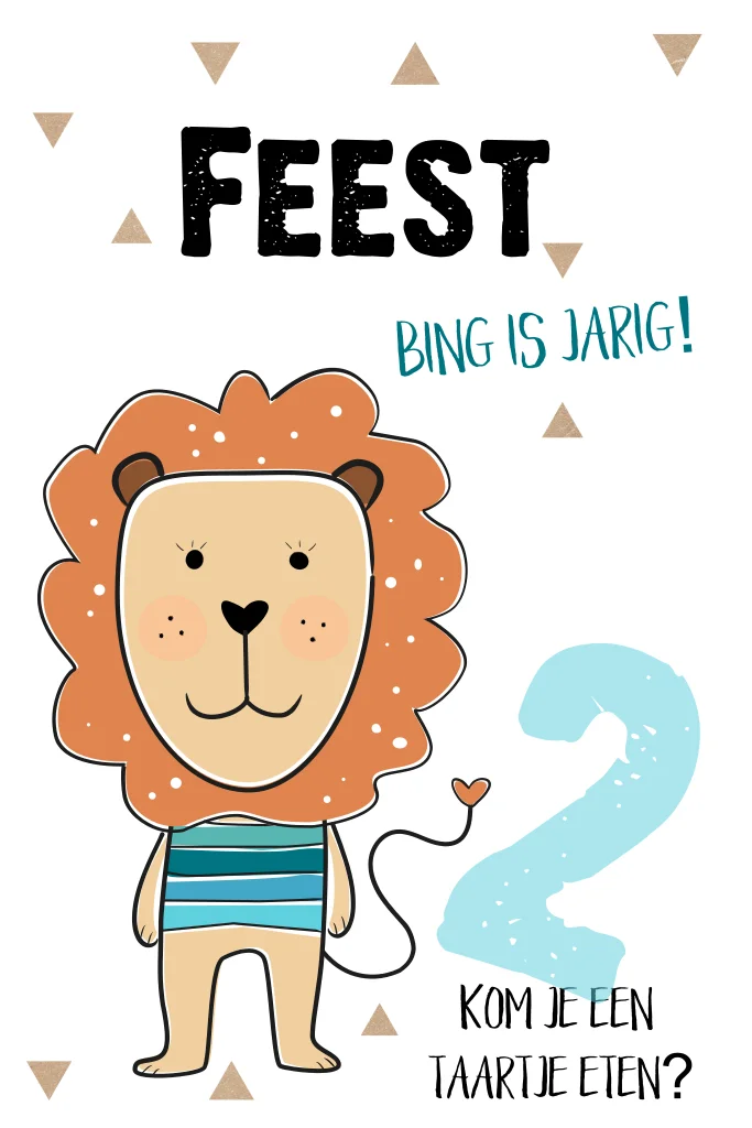 FEEST, je bent 2 jaar! Dit lieve uitnodigingskaartje met leeuw en speelse driehoekjes is leuk voor een jongen. Met eigen teksten en een bijpassende envelop maak je hem zelf compleet!