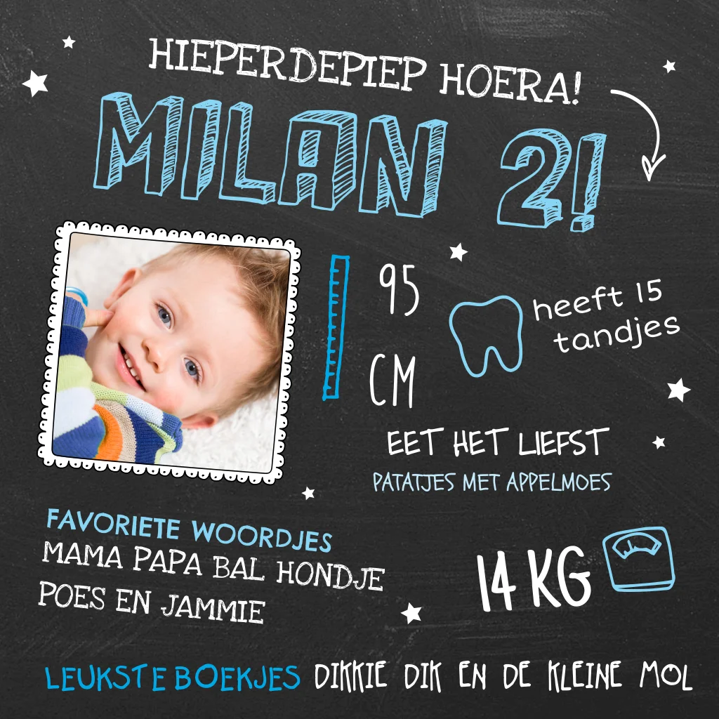 Trendy zeg: zo'n stoere krijtbord-achtergrond! Leuk voor de verjaardag van een zoontje. Met de blauwe icoontjes, vrolijke sterren en eigen foto is hij helemaal compleet. Wanneer is jullie feest? Pas de teksten aan in de online editor en upload een coole foto van de kleine man voor een unieke uitnodiging!