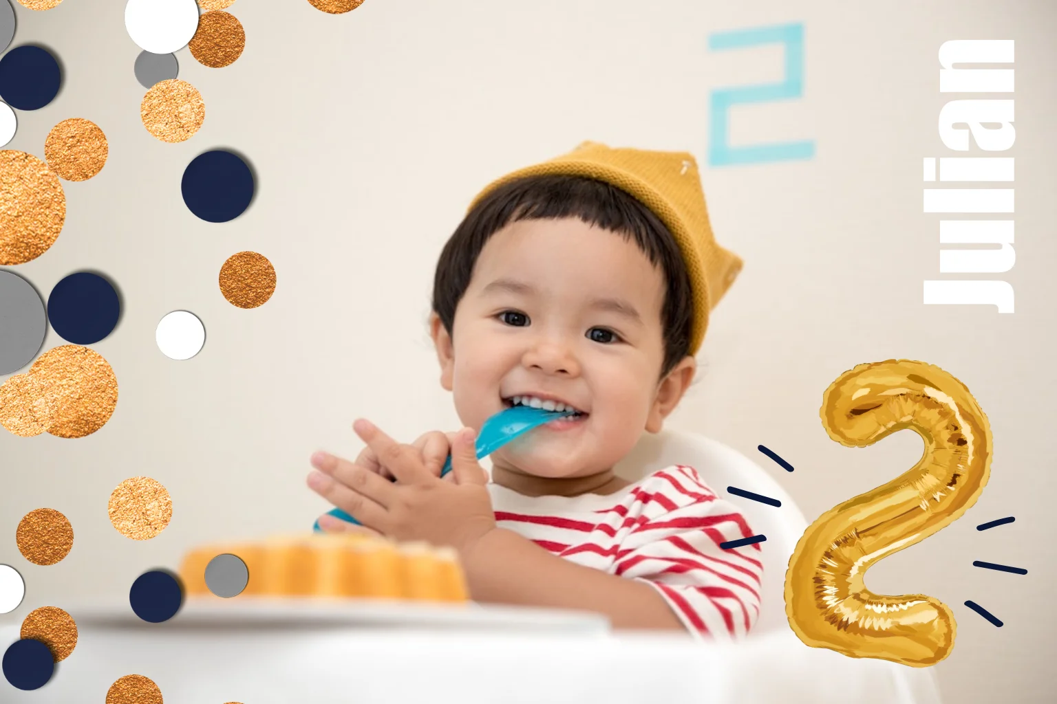 Wordt jullie zoontje alweer 2? HOERA! Nodig zijn vriendjes uit met deze foto-kaart met confetti en goudkleurige ballon. Je kunt zelf een toffe foto kiezen voor op de achtergrond en de tekst aanpassen in de online editor voor een uniek kaartje!