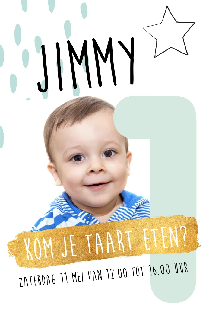 Een hip kaartje voor de eerste verjaardag van jullie zoontje. Upload een leuke foto van de kleine man en zet de naam erboven in trendy letters, je doet dit in de online editor. De mintgroene 1, de ster en de tekstbanner in goud maken dit kaartje helemaal trendy!