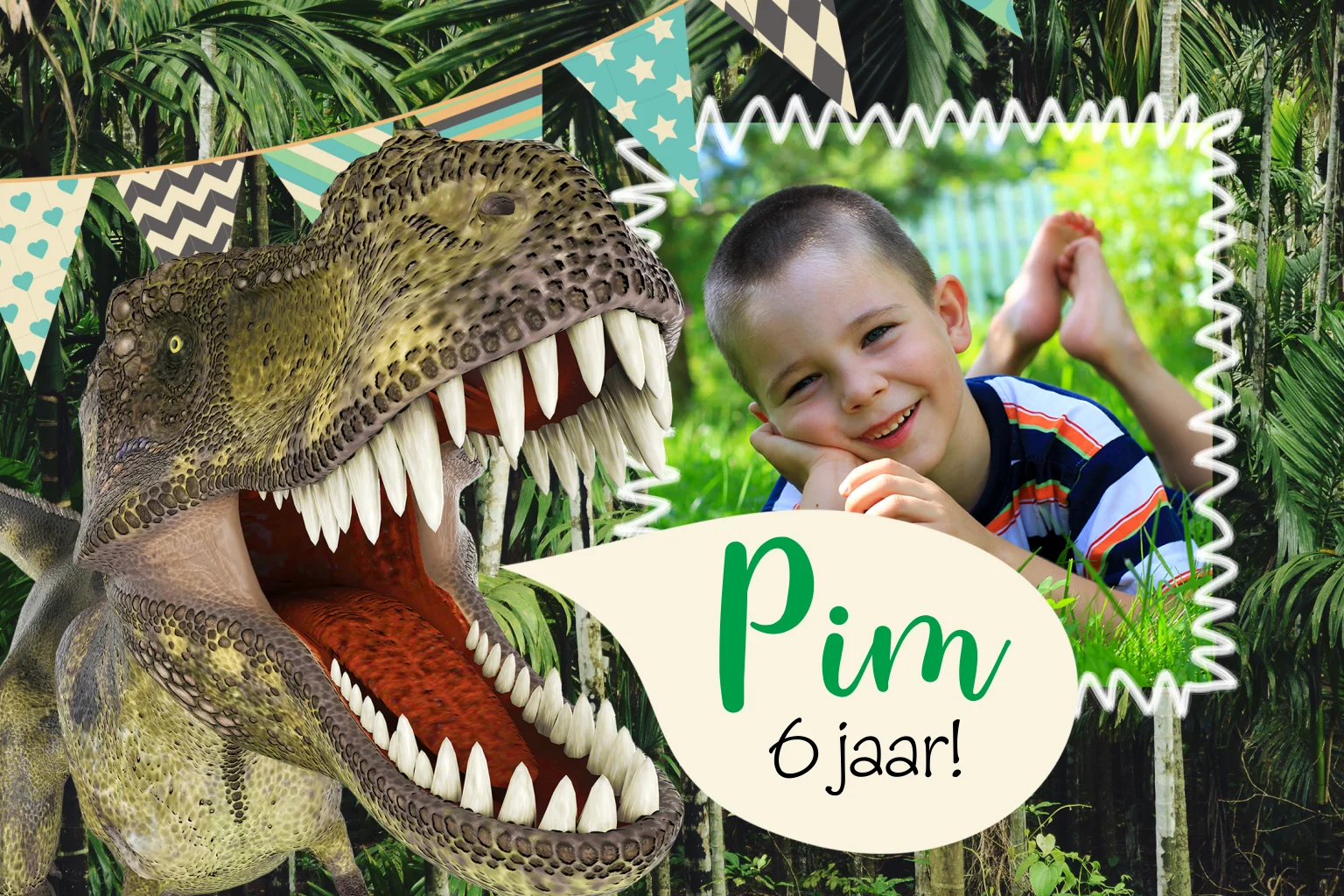 Een stoere uitnodiging voor het kinderfeestje van een jongen. Een grote dinosaurus op een jungleachtergrond laat duidelijk weten wie de jarige is! In het kader naast de vlaggetjeslijn kun je een foto van jullie zoontje uploaden in de editor, daar pas je ook de teksten naar wens aan.