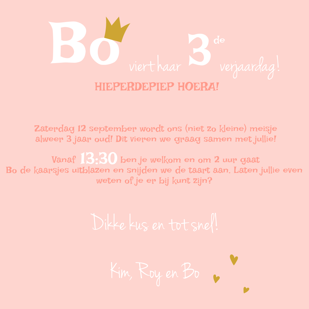 Wordt jullie kleine prinsesje alweer drie? Nodig vriendjes en vriendinnetjes uit met dit lieve roze kaartje met hartjes, 3'en en een leuk kroontje boven de naam. Upload een leuke foto van jullie dochter en voeg eigen tekst toe in de online editor voor een uniek kaartje!