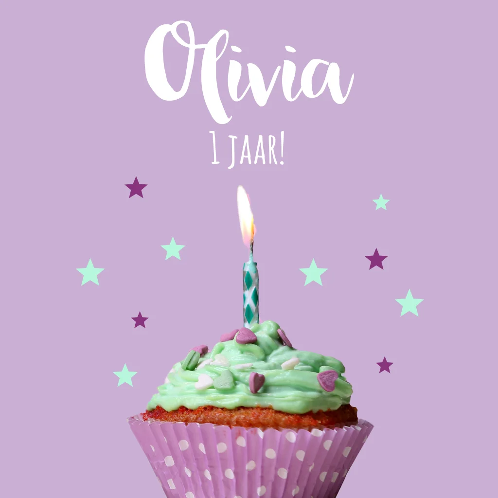 Vrolijke uitnodigingskaart voor het eerste verjaardagsfeestje van jullie dochter. Op de voorkant staat een mintgroene cupcake met 1 kaarsje en gekleurde sterretjes op de lila achtergrond. De vrolijke letters maken het helemaal af!