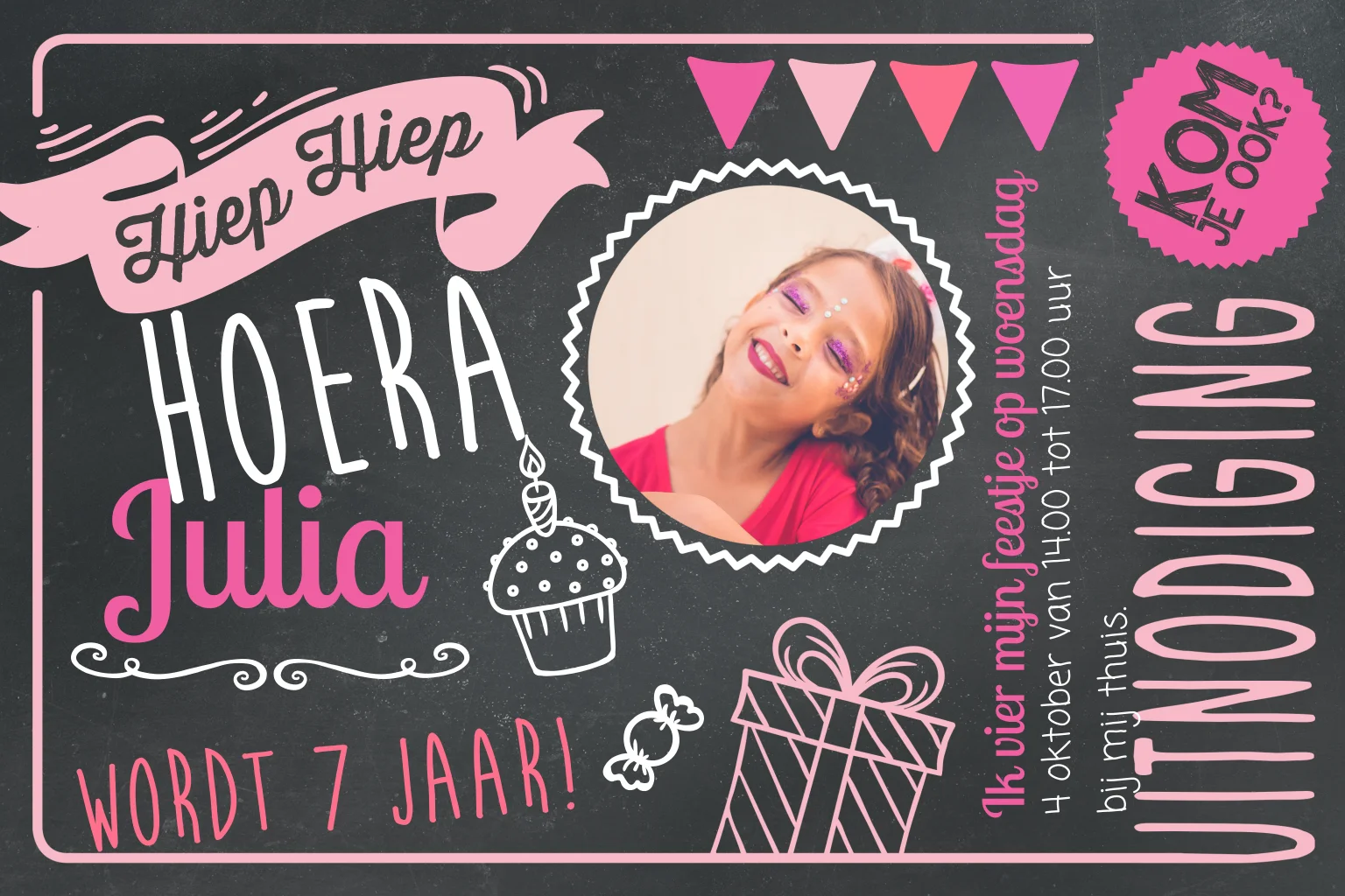 Ben je op zoek naar een stoere verjaardagskaart voor je dochter? Dan is dit kaartje helemaal wat je zoekt! Met roze illustraties zoals een cupcake en cadeautje op een zwarte krijtbord achtergrond. Plaats op de voorkant een mooie foto en schrijf op de achterkant het verlanglijstje!
