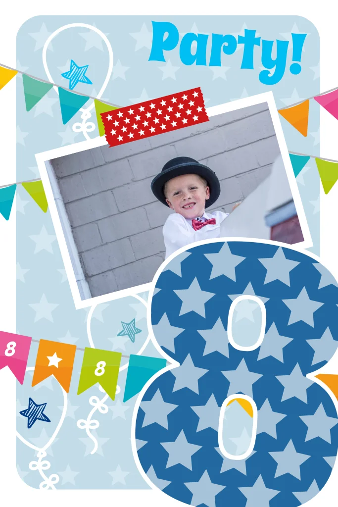 Wat een feestelijk verjaardagskaartje met kleurrijke slingers, een 8 met sterrenprint en een eigen foto! Leuk voor een jongen. Schrijf je eigen tekst op de achterkant in de editor en upload een stoere foto voor een uniek kaartje!
