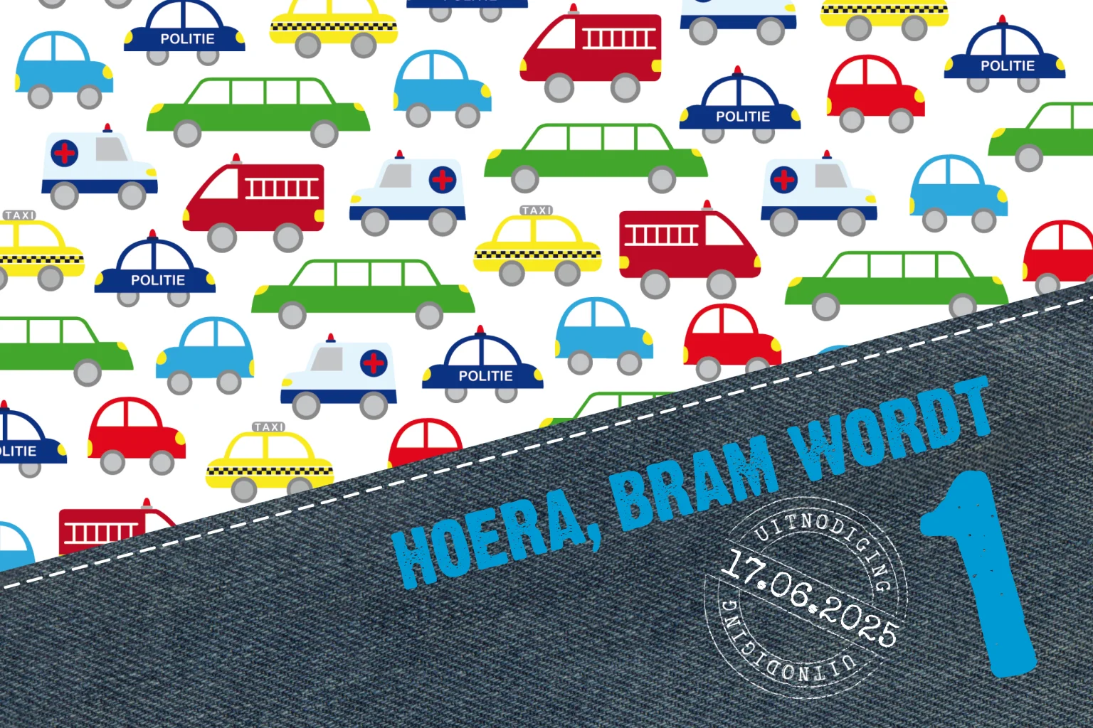 Wordt jullie zoontje 1 jaar? Organiseer een feestje en stuur dit stoere kaartje met gekleurde auto's en een jeans-print onderaan, waar een leuk stempel op staat met de datum. Pas de teksten eenvoudig zelf aan in de online editor, zo gedaan!