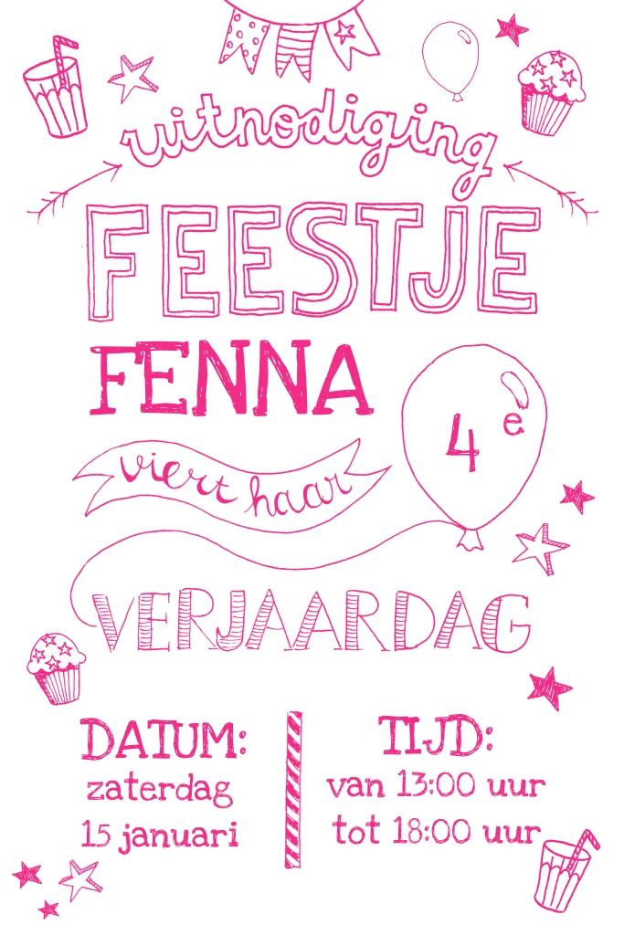 Wordt jullie dochter bijna 4 jaar? Gefeliciteerd! Stuur deze vrolijke verjaardagskaart om al haar vriendjes en vriendinnetjes uit te nodigen. Met feestelijke teksten, lettertypes en illustraties in roze. Liever een andere kleur? Pas het gemakkelijk zelf aan in de editor.