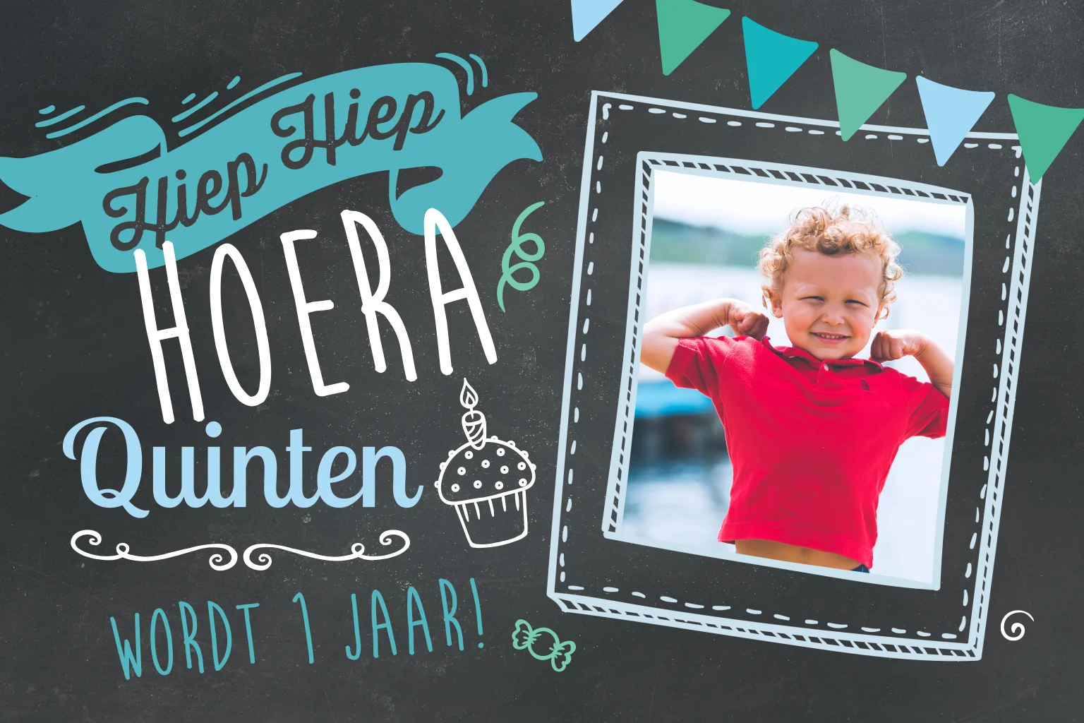 Wordt je zoontje 1 jaar? Dat is reden voor een groot feest! Stuur deze stoere uitnodiging voor zijn eerste kinderfeestje! Met vrolijke krijttekeningen als versiering op een krijtbord achtergrond is dit echt een feestelijk kaartje! In de online editor kun je op de voorkant een mooie foto van de kleine man plaatsen.