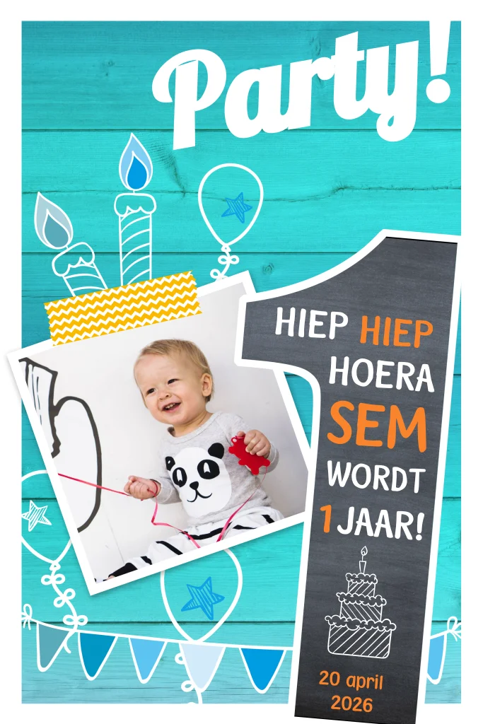Jouw kleintje is alweer 1: Party! Dit stoere kaartje met turqoise houtachtergrond, ballonnen, slinger en kaarsjes is leuk voor een zoontje. Heel tof zijn de grote 1 met tekst erin en de eigen foto! Upload een leuke foto en pas de teksten aan in de editor voor een uniek kaartje!