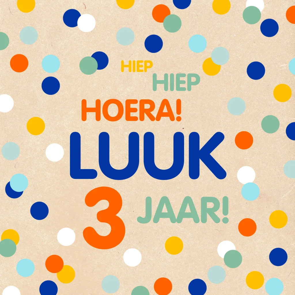 Hiep hiep hoera! Wat een vrolijke verjaardagskaart om de vriendjes en vriendinnetjes van jullie zoontje uit te nodigen voor een gezellig kinderfeestje. Hij is helemaal versierd met confetti-stippen en is echt kleurrijk. Leuk voor een jongen van 3! Alleen nog even de teksten aanpassen in de online editor en de uitnodiging kan verstuurd!