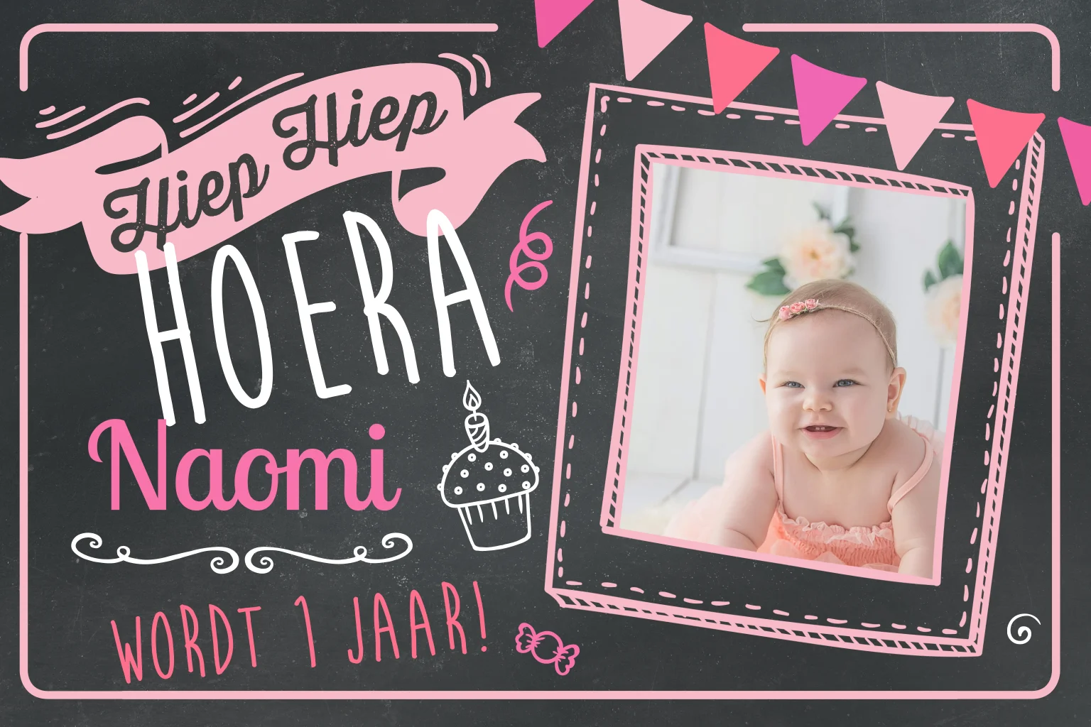 Lief verjaardagskaartje met roze vlaggetjes voor een meisje van 1, de 1 kun je natuurlijk gemakkelijk aanpassen in de editor voor een andere leeftijd. Speciaal is de krijtbordachtergrond met teksten en tekeningen in wit en roze. Met een eigen foto maak je dit feestelijke kaartje helemaal af!
