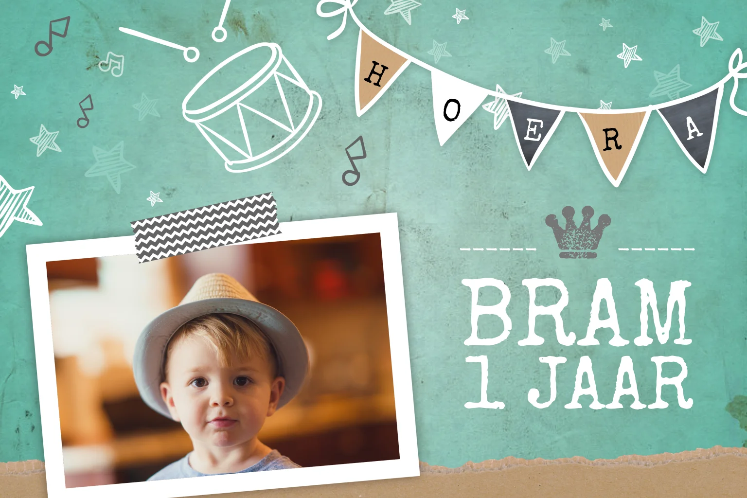 Hip kaartje in mintgroen voor de 1ste verjaardag van een zoontje! Hij is versierd met een slinger en vrolijke illustraties, zoals een trommel en muzieknoten. Maak het compleet met een eigen foto en schrijf je tekst op de achterkant in de online editor!