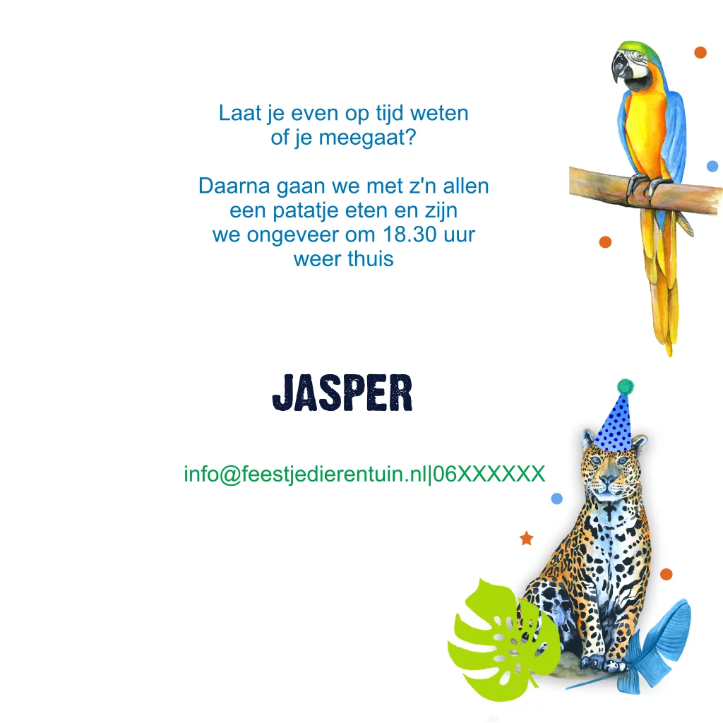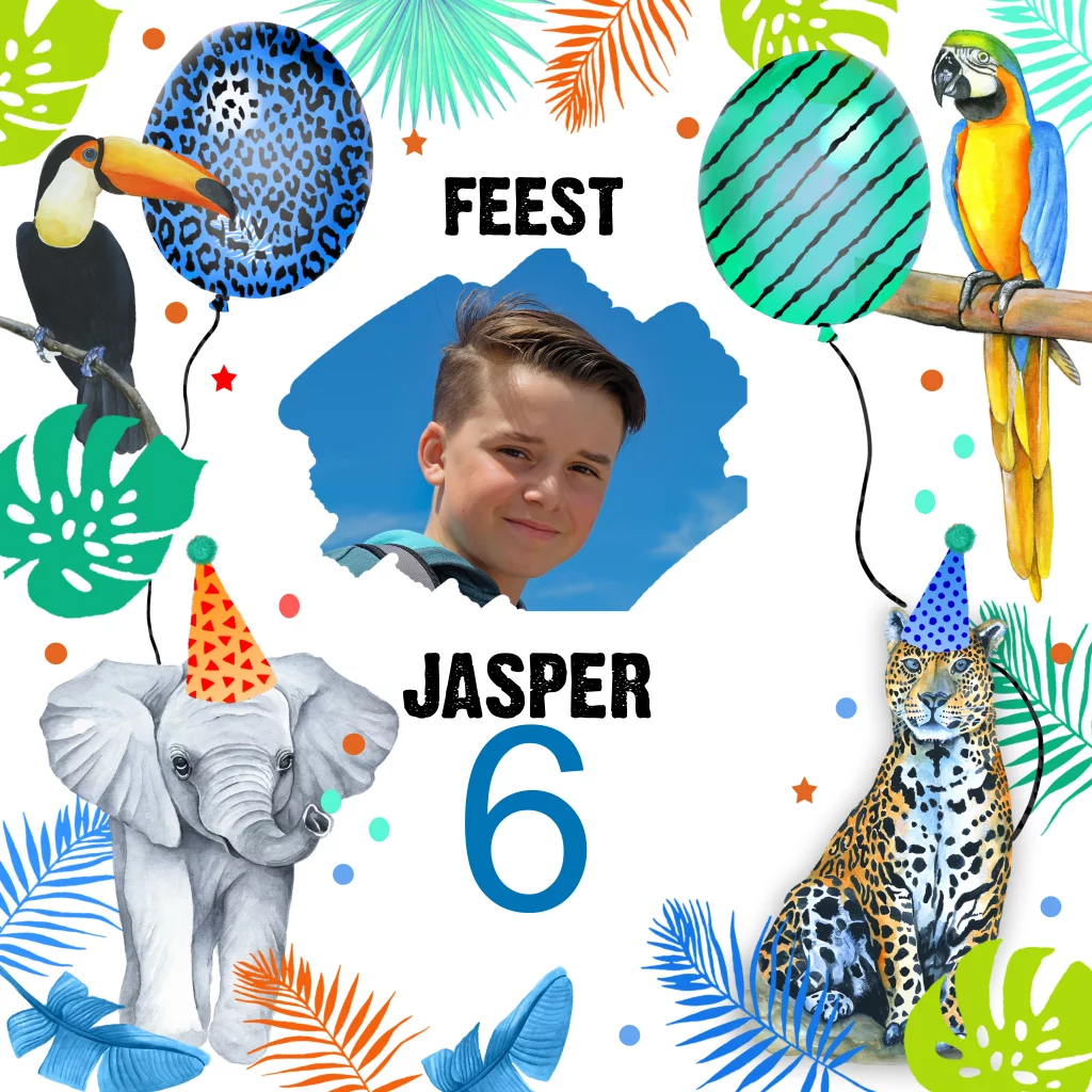 Vrolijke uitnodiging voor de 6e verjaardag van jullie zoon. Met deze kleurrijke uitnodiging gaat het zeker een feestje worden om nooit meer te vergeten. Op de feestelijke achtergrond vol met ballonnen en kleurrijke bladeren staan een kaketoe, papegaai, luipaard en olifant. Ook de binnen- en achterkant zijn in hetzelfde thema geïllustreerd, een vrolijke kaart! Pas eenvoudig zelf de tekst, kleuren en foto aan in de online editor.