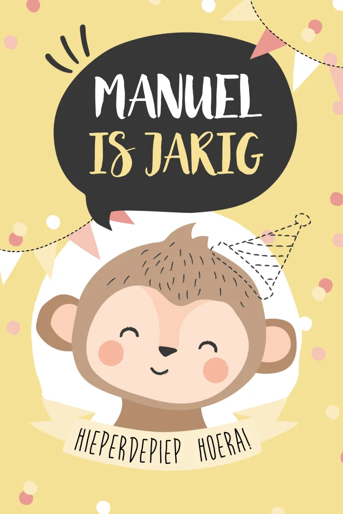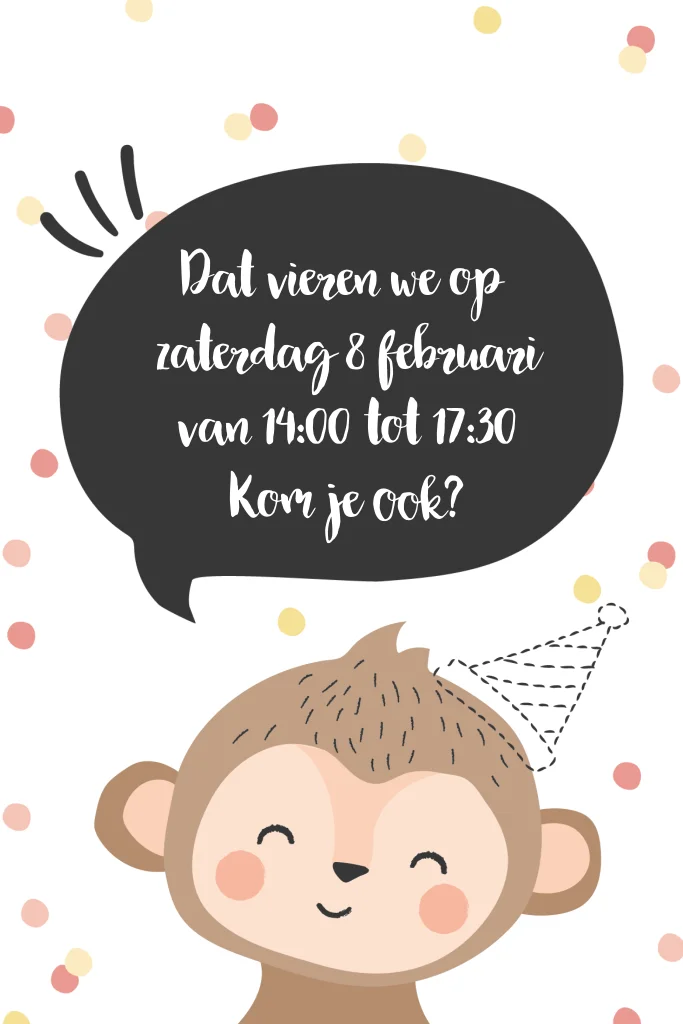 Vrolijke uitnodiging kinderfeestje met aap en slingers