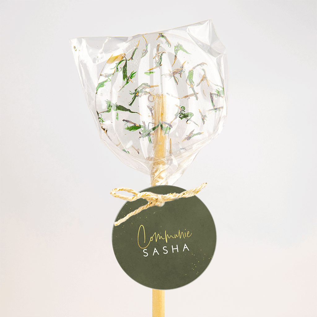 Communie labeltje met goudfolie elementen op donkergroen.