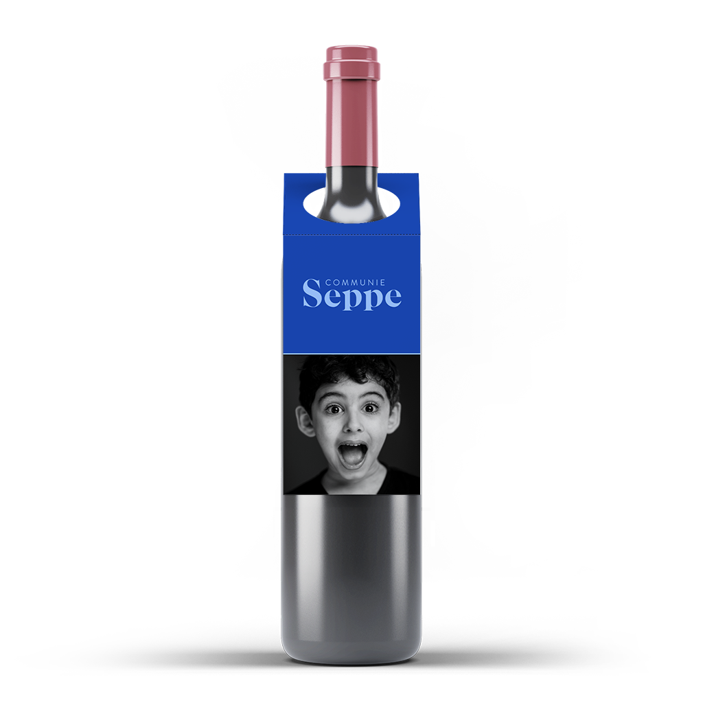 Leuke flessenhanger in colourblock van kobaltblauw met lichtblauw en ruimte voor eigen foto in het vierkant. De naam staat in stoer lettertype, maak de hanger persoonlijk in de online editor.