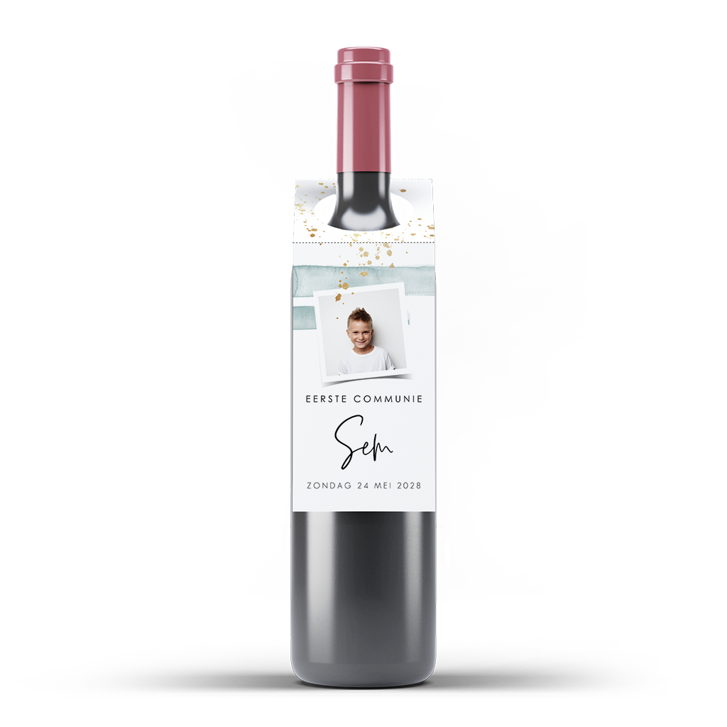 Leuke flessenhanger in de stijl van de communiekaart. Op de witte achtergrond staan mintgroene aquarel strepen met een foto in polaroidstijl ervoor. De vrolijke gouden spetters maken het extra feestelijk.