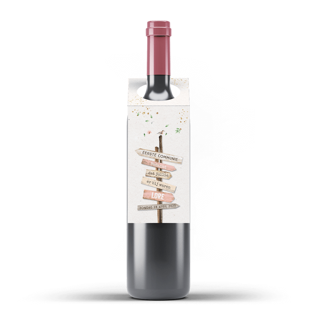 Superleuk, een flessenhanger in de stijl van de communiekaart! Op een pastelroze achtergrond staat een houten wegwijzer in roze en bruin met een vogeltje erop. Er omheen een wolk van bloemetjes, blaadjes en confetti.