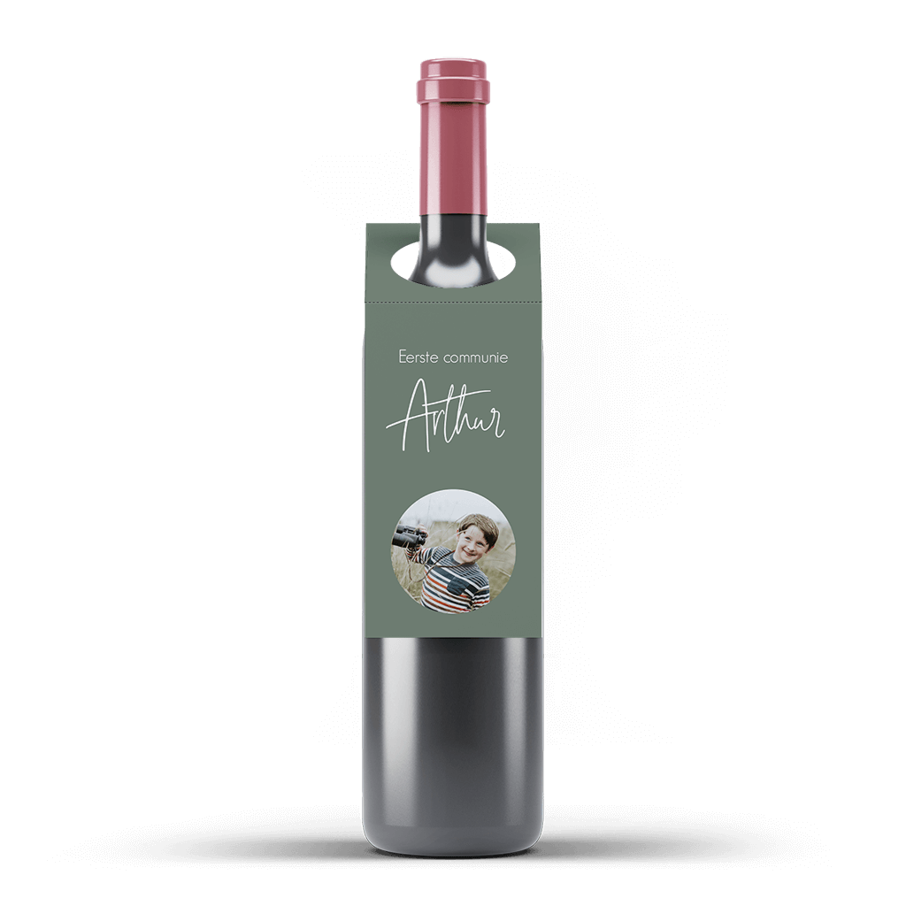 Stoere flessenhanger in grijsgroen met ruimte voor een leuke eigen foto in de cirkel. De tekst staat in wit in trendy lettertype, pas de hanger naar wens aan in de online editor.