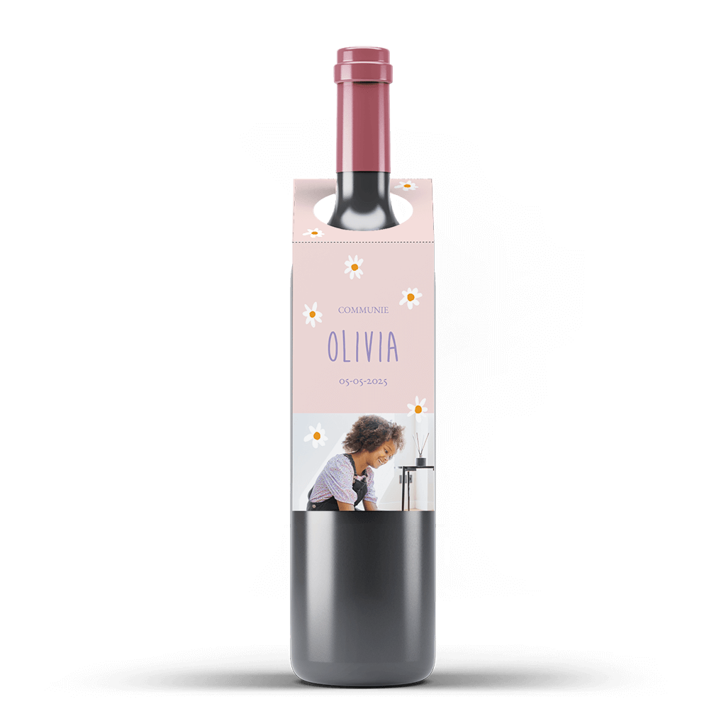 Een flessenhanger in de stijl van de uitnodiging, op een roze achtergrond staan madeliefjes, onderaan kun je een leuke eigen foto uploaden in de online editor.