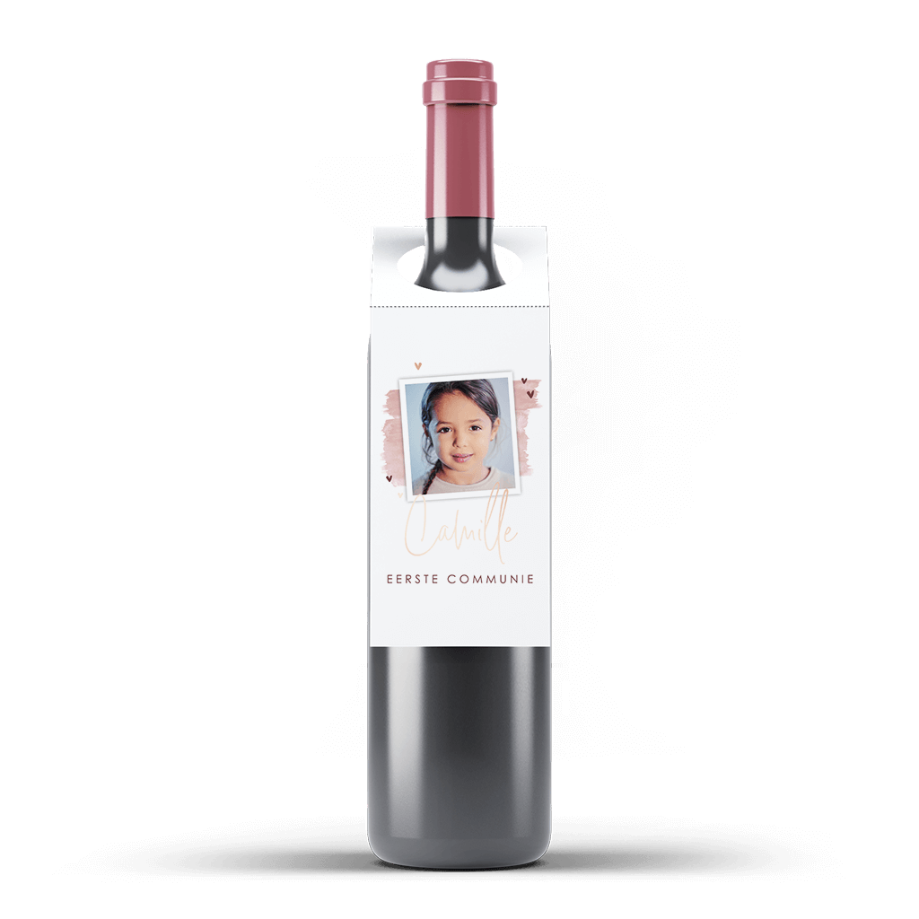 Leuke flessenhanger in de stijl van de uitnodiging, op de witte achtergrond staat een roze waterverfvlak met een foto in polaroid stijl. De naam staat in trendy lettertype in roségoudfolie; de kleine hartjes zorgen voor een lief accent.