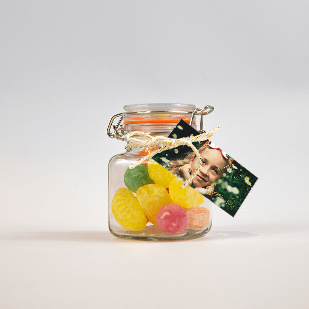 Leuk fotolabeltje met goudfolie typografie! Het labeltje kan gemakkelijk in de editor aangepast worden. Op het labeltje kun je een foto uploaden van je zoon of dochter die communie gaat doen echt uniek!