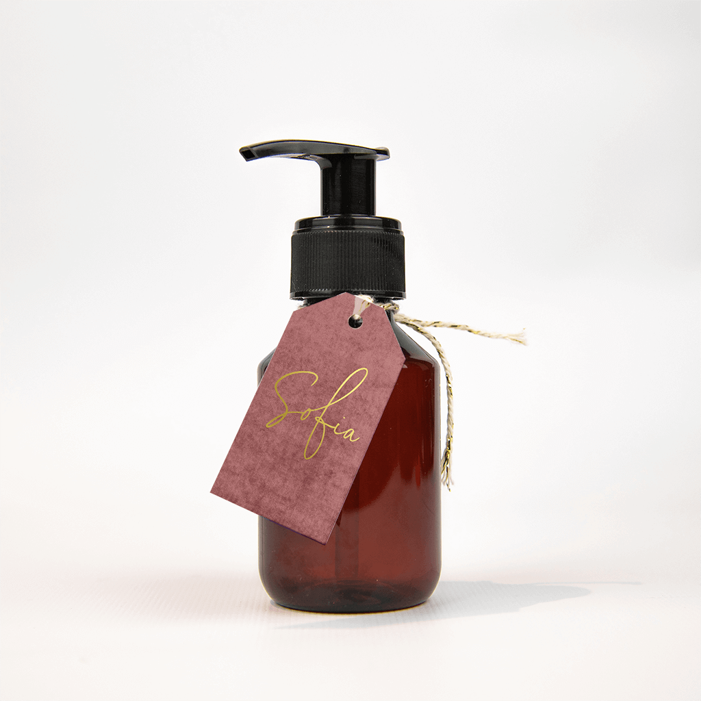 Luxe labeltje voor een bedankje bij de communie van een meisje. Op de oudroze velvet-look achtergrond komt de naam in goudfoliedruk mooi naar voren.