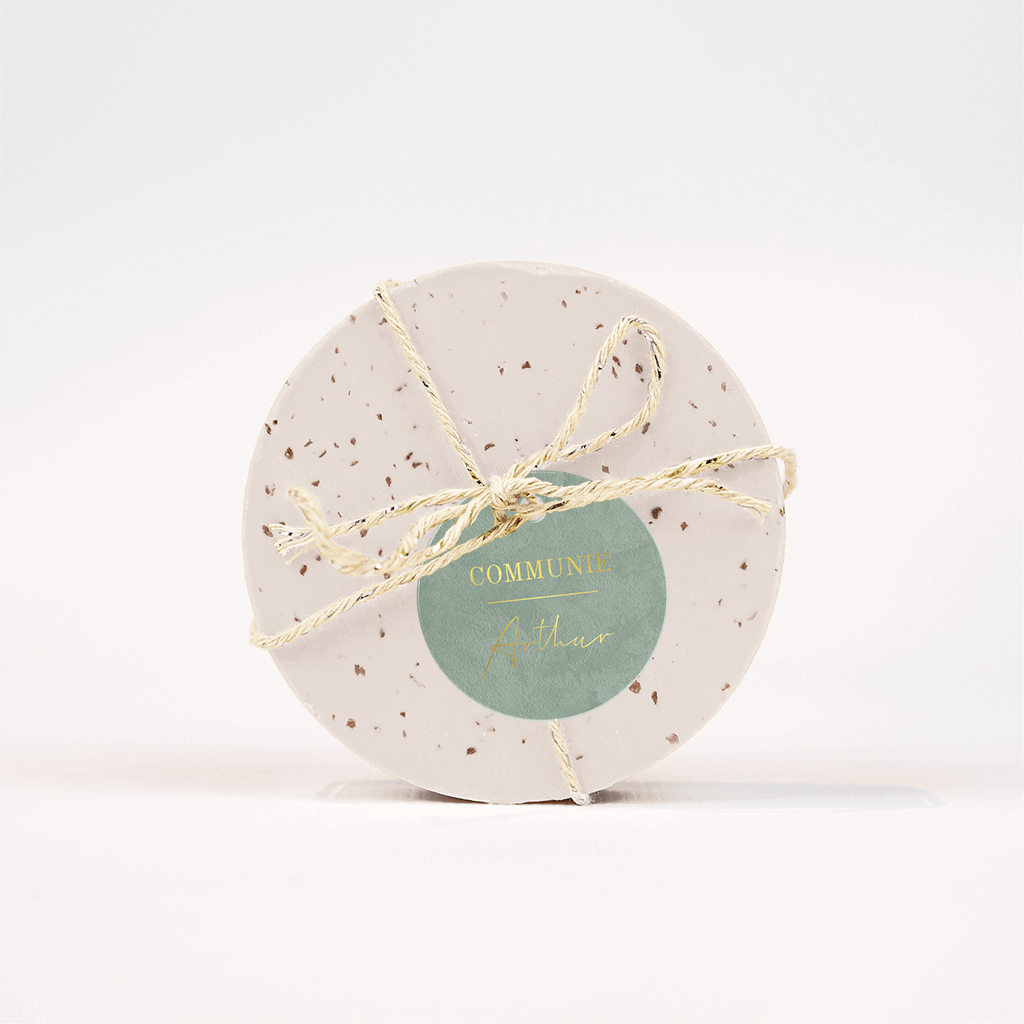 Een stijlvol labeltje bij de communie van jullie zoon! Op de mintgroene achtergrond in velvetlook staat de tekst in goudfolie, super chique!