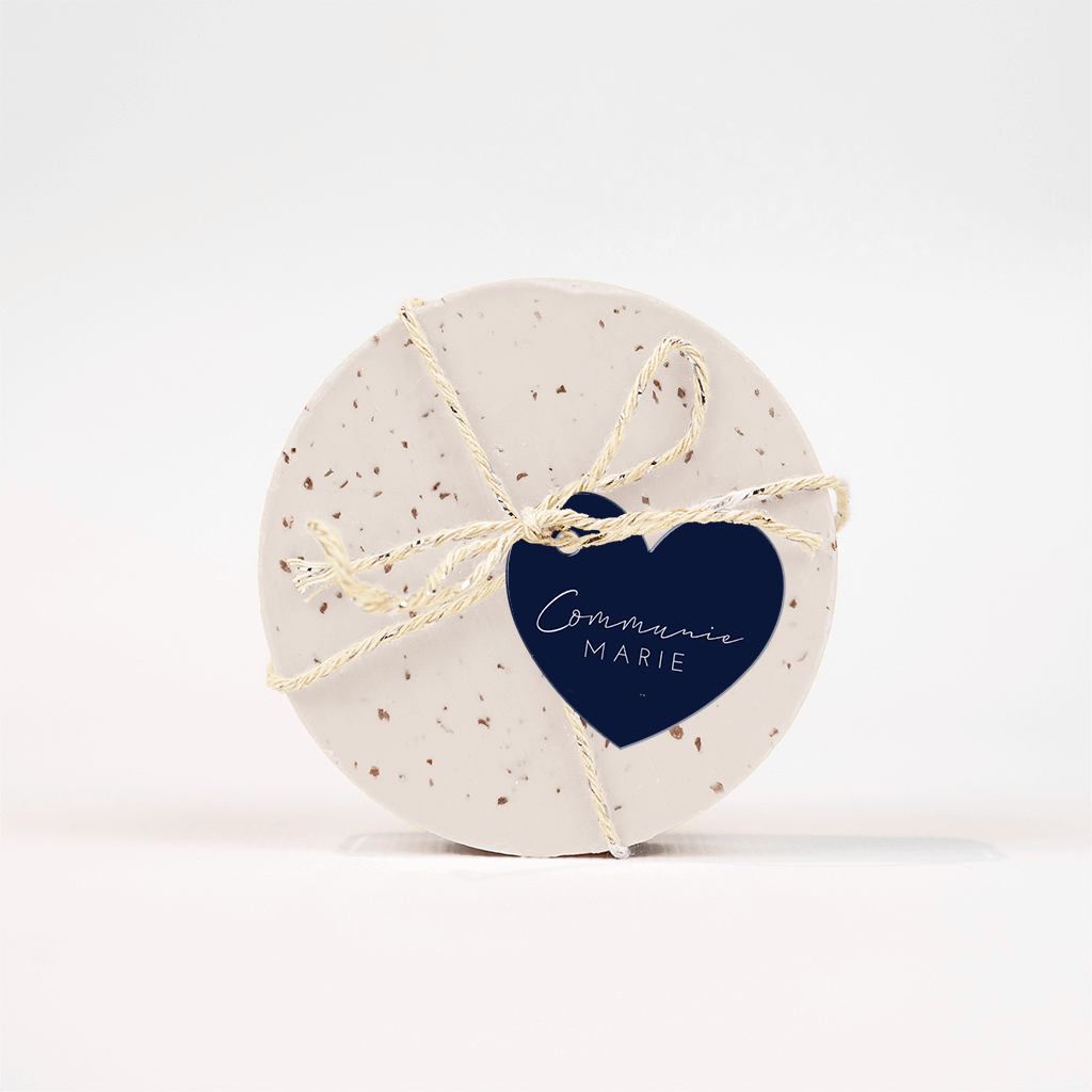 Een lief labeltje in de vorm van een hart voor bij de communie. Op de donkerblauwe achtergrond komt de witte tekst mooi naar voren! Pas de tekst eenvoudig zelf aan in de online editor en maak het label persoonlijk.