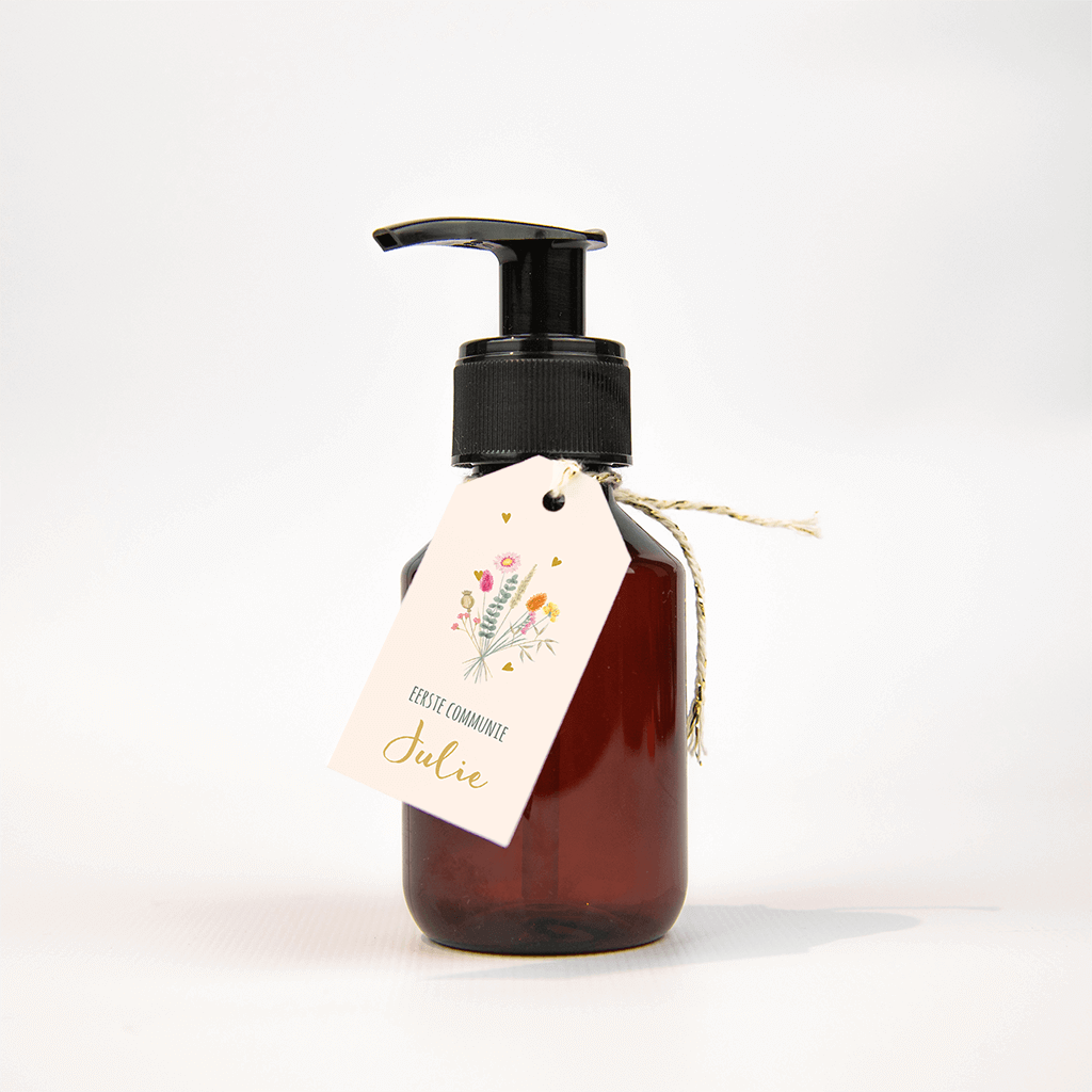 Ben je op zoek naar een labeltje voor de communie bedankjes? Kies dan voor dit trendy labeltje met veldbloemen en hartjes. Perfect voor een lente- of een communiefeest van een meisje!