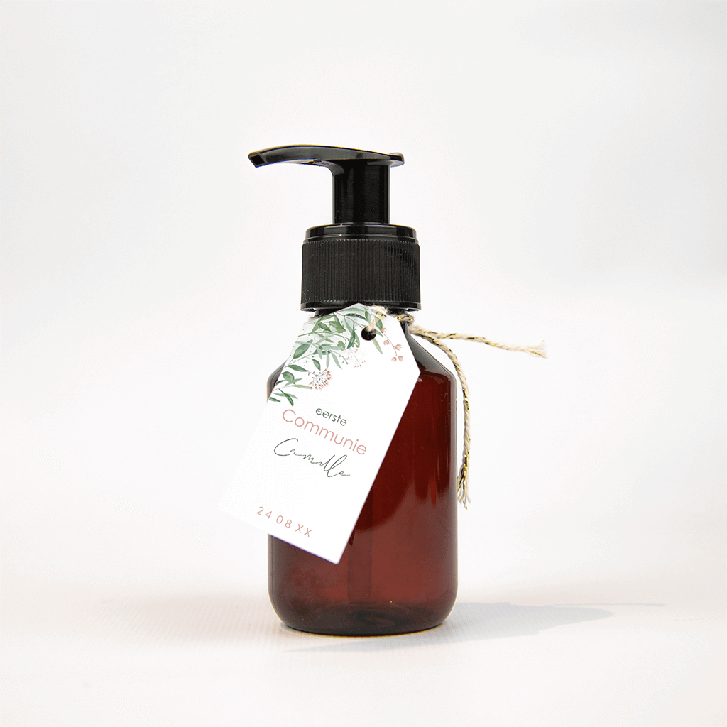 Een stijlvol label bij de communie uitnodiging van een meisje, met mooi getekende takjes en bloemen in groen en roze. Door gebruik van verschillende lettertypes en bijpassende kleuren een mooi geheel!