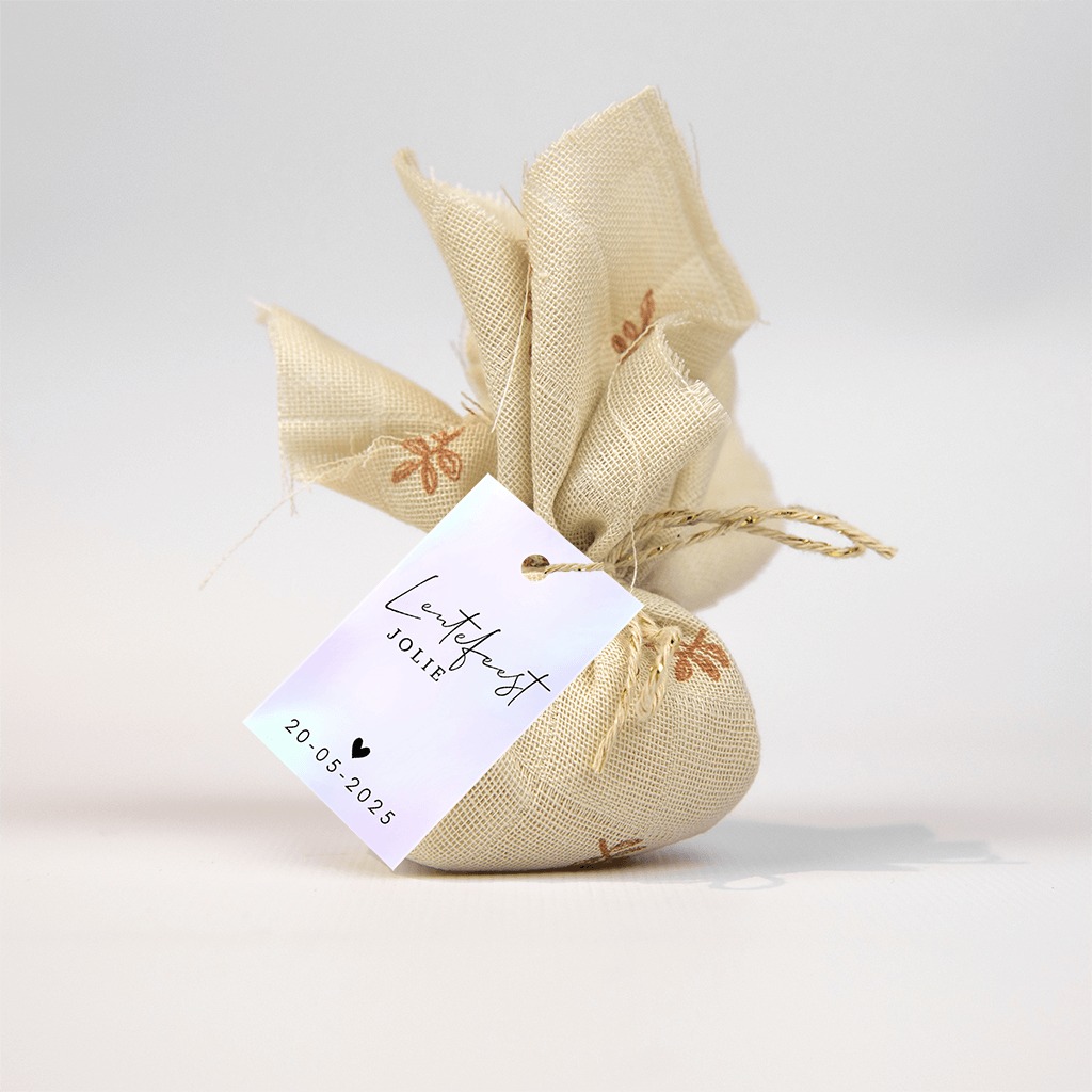 Trendy label in holografische look, helemaal hip! Op de roze lichtblauwe achtergrond komt de tekst in moderne letters mooi naar voren, het kleine hartje boven de datum maakt het extra lief.