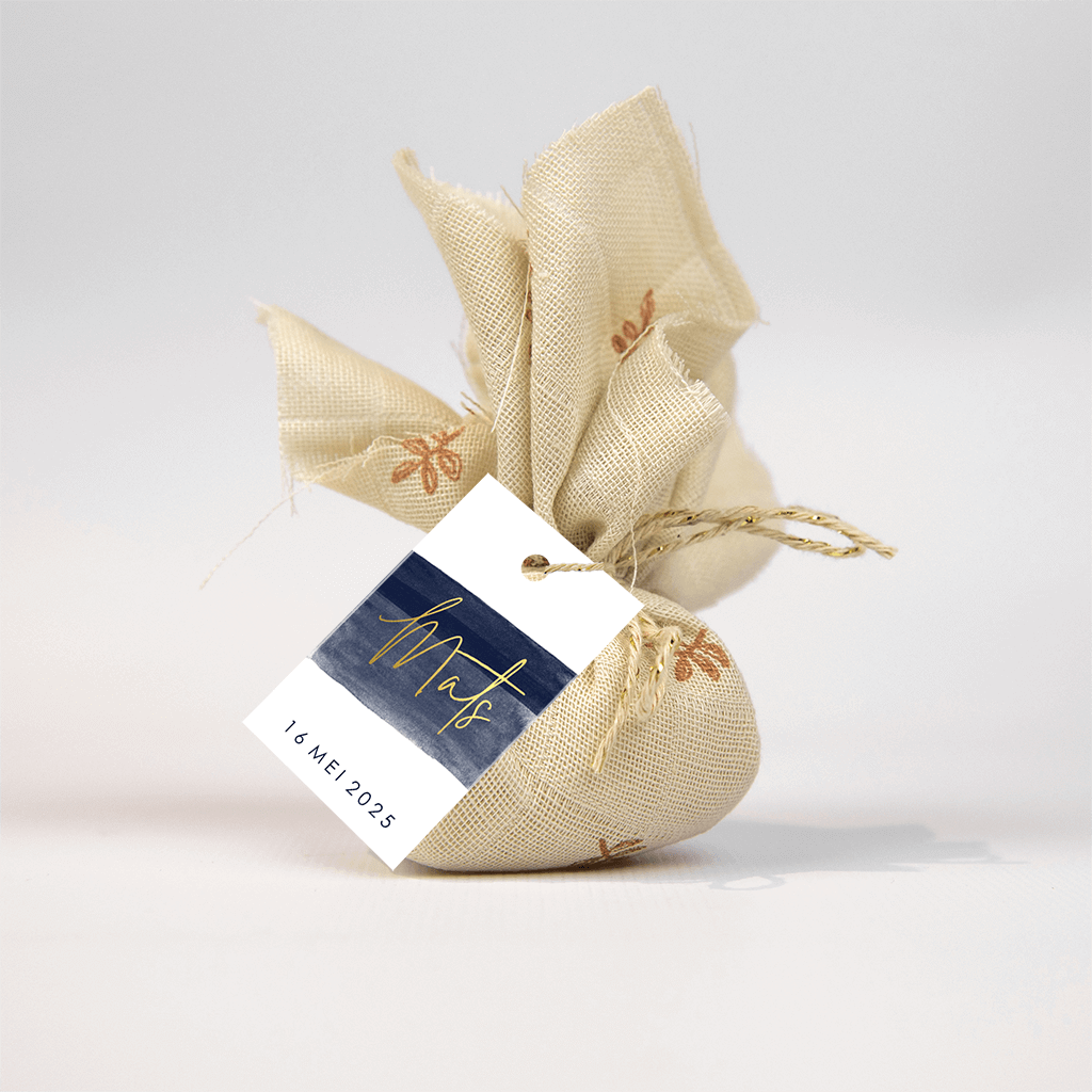 Mooi labeltje voor bij de communie van een jongen. Op dit langwerpige label staat een donkerblauwe waterverfstreep met daarop de naam in goudfoliedruk, chique!