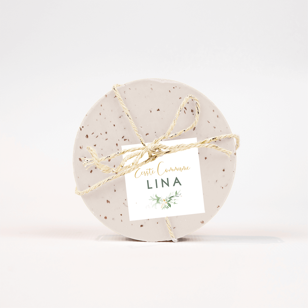 Leuk label voor de bedankjes bij de communie. De tekst staat in trendy lettertype met een mooi bloementakje in aquarel.