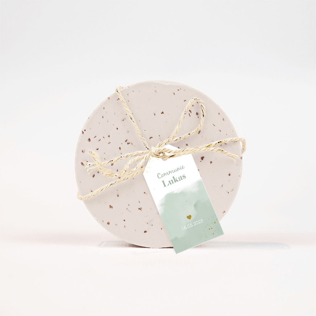 Labeltje communie met groene waterverf en goudfolie elementen - 18 stuks