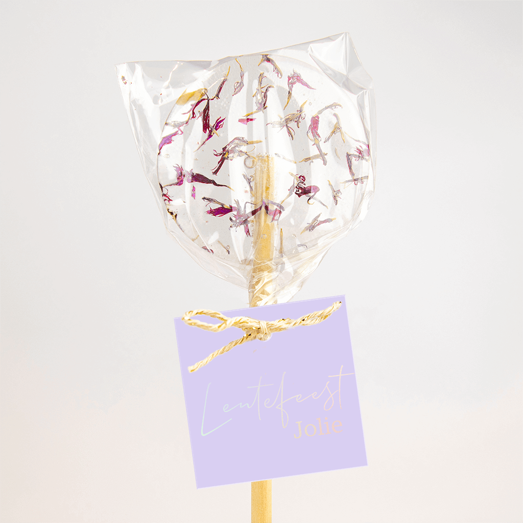 Lila vierkant labeltje met de tekst in holografische folie- 16 stuks.