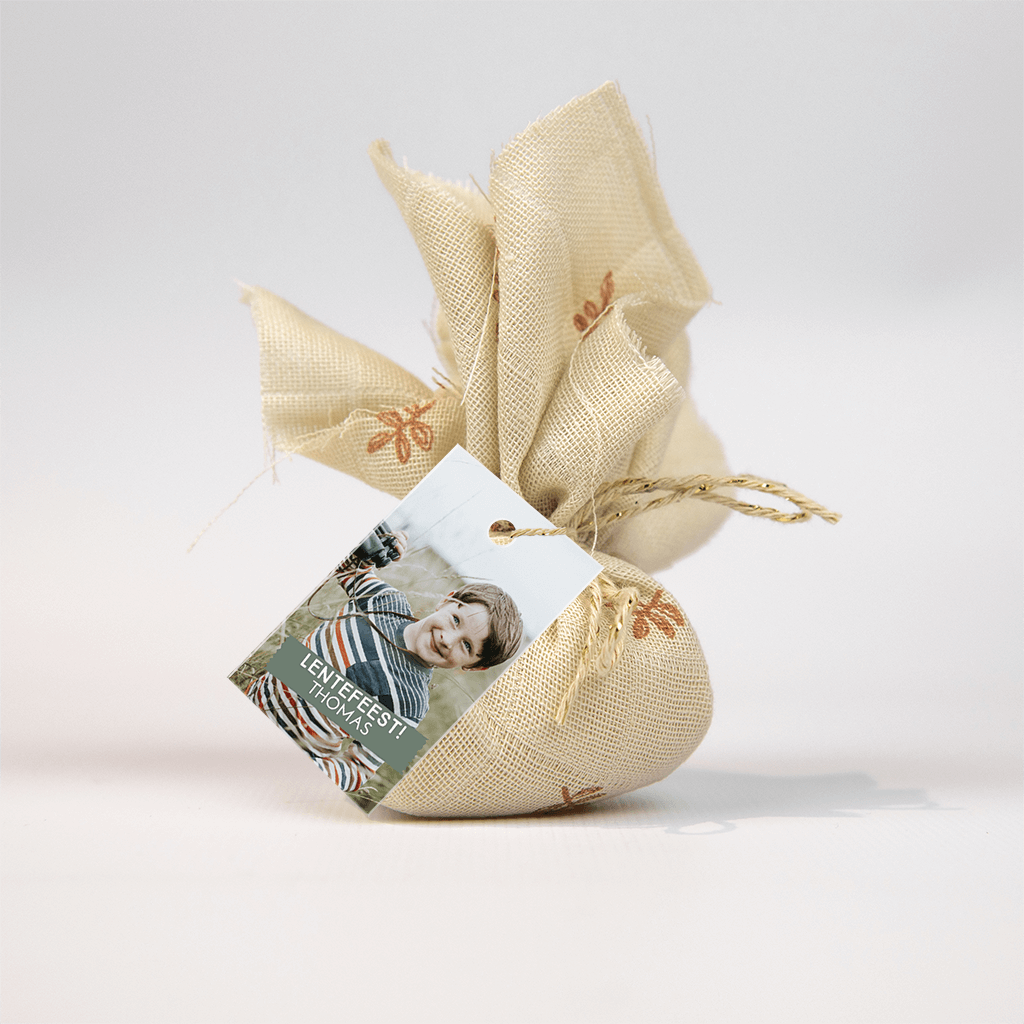 Leuk labeltje voor het lentefeest met ruimte voor een eigen foto, in de groene balk kun je eigen tekst toevoegen in de online editor.