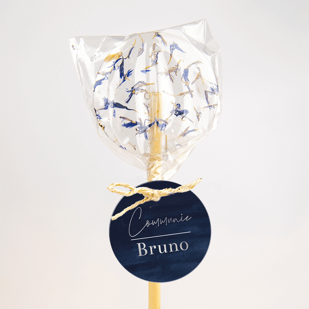 Hip label voor bij de uitnodiging communie. Op een donkerblauwe velvetlook achtergrond staat de tekst in moderne witte trendy letters, helemaal trendy!