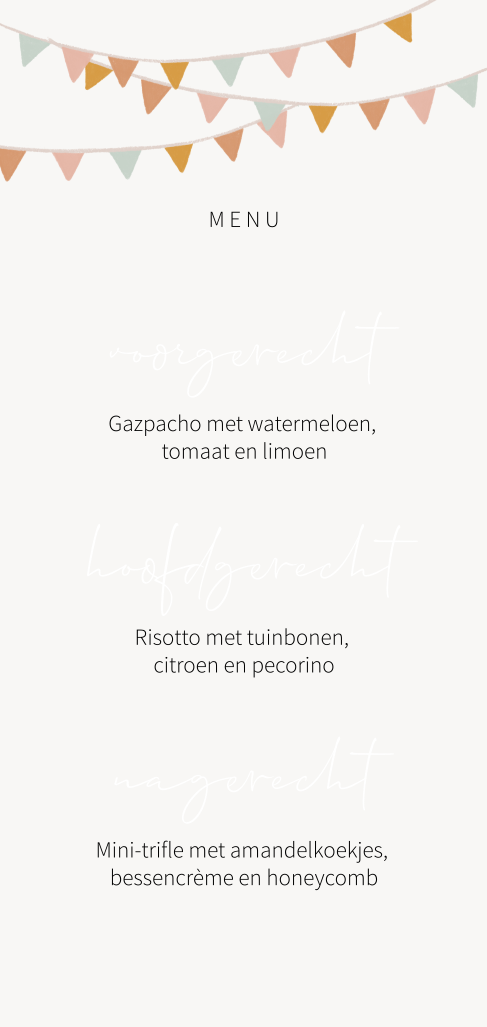 Langwerpige menukaart passend bij de uitnodiging voor het 21 diner. Een feestelijke vlaggetjesslinger staat boven het menu, vrolijk! Een deel van de tekst is in roségoudfolie, dat past mooi bij het design.