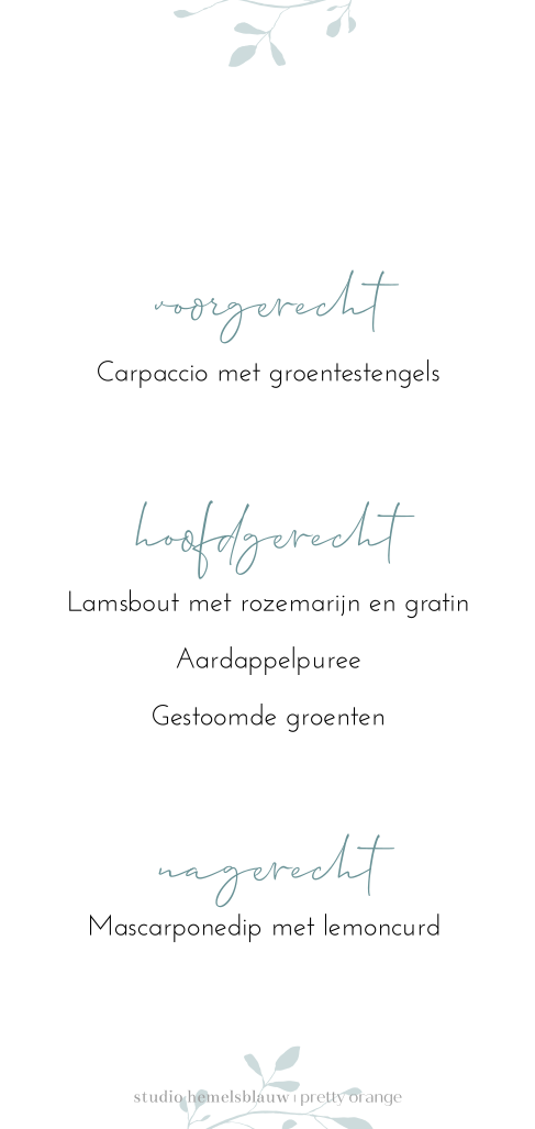 Witte menukaart voor een 21 dinner met 'menu' in roségoudfolie gedrukt. Erboven staat een getekend lichtblauw takje en de tekst is in bijpassende kleuren. Op de achterzijde is ruimte om een persoonlijke foto te uploaden in de online editor.