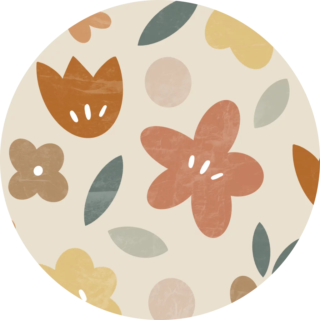 Een vrolijke beige sticker met getekend bloemen design, deze past mooi bij de uitnodiging met bloemen. De blaadjes en bloemetjes op deze ronde sticker zijn in blauw, grijs, geel en steenrood.